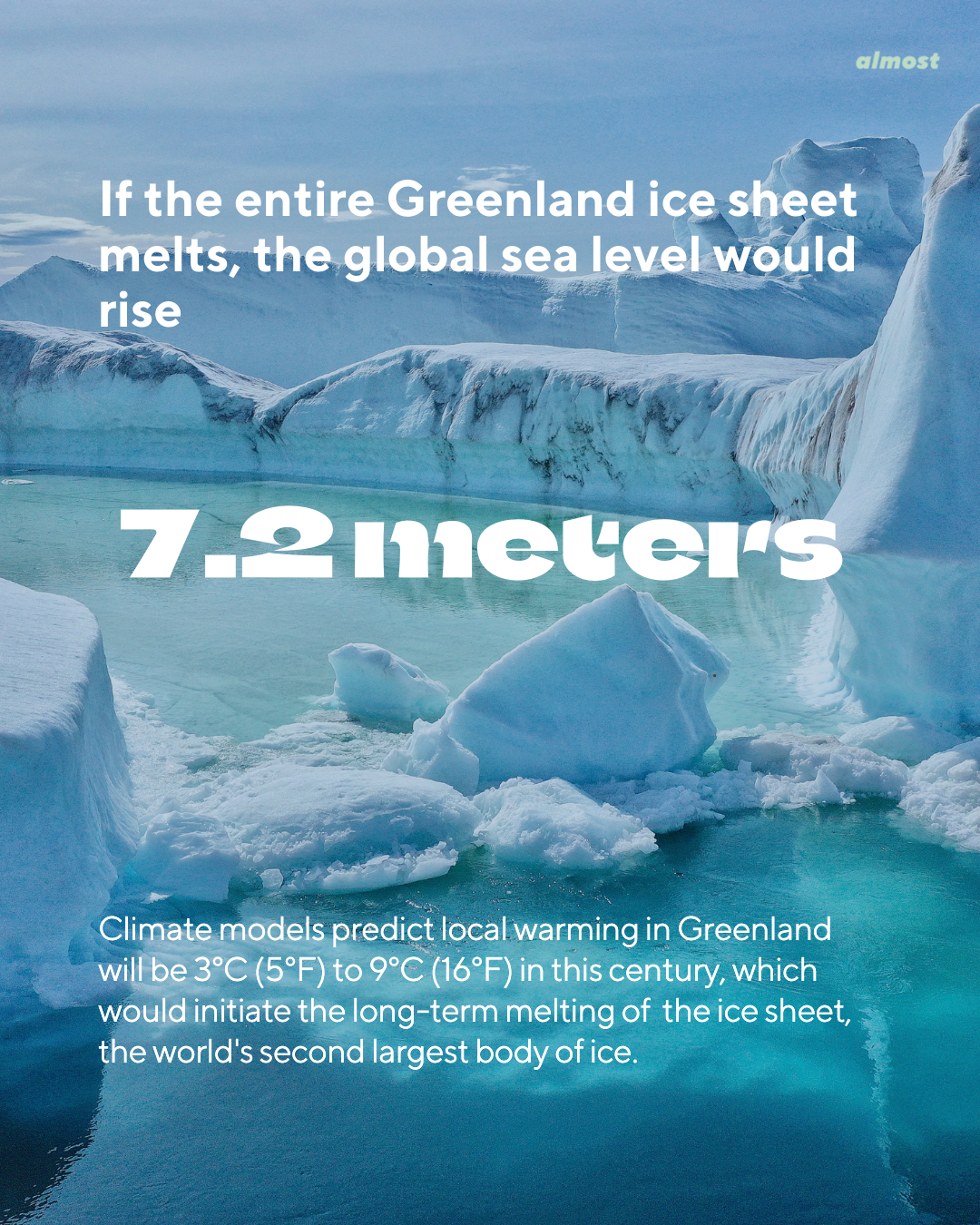 If the entire Greenland ice sheet melts, the global sea level would rise 7.2 meters.
