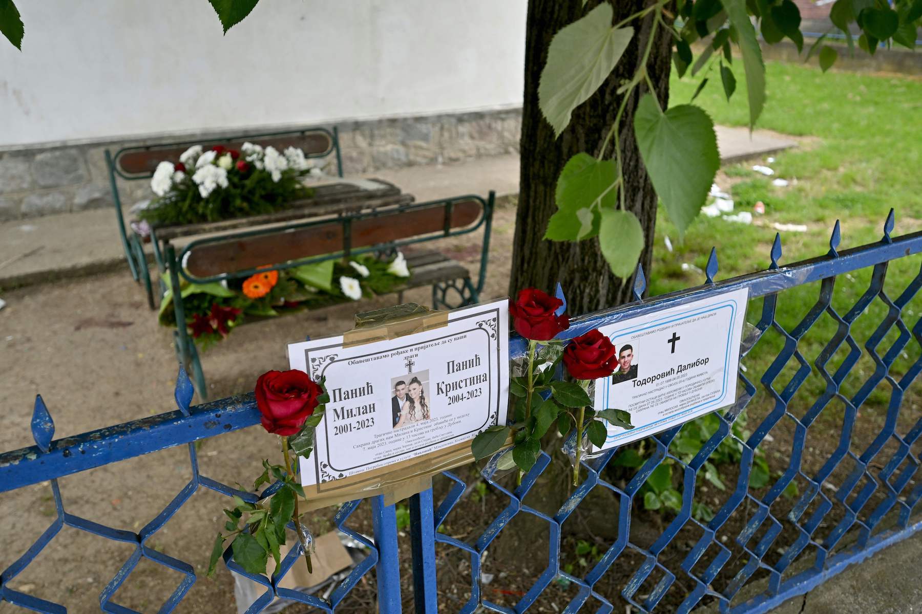 Memorial placards and red roses for three people killed at a school yard in the village of Dubona near the town of Mladenovac, about 60 kilometres (37 miles) south of Serbia’s capital Belgrade, on May 6, 2023, in the aftermath of a drive-by shooting. (Photo by ANDREJ ISAKOVIC/AFP via Getty Images)