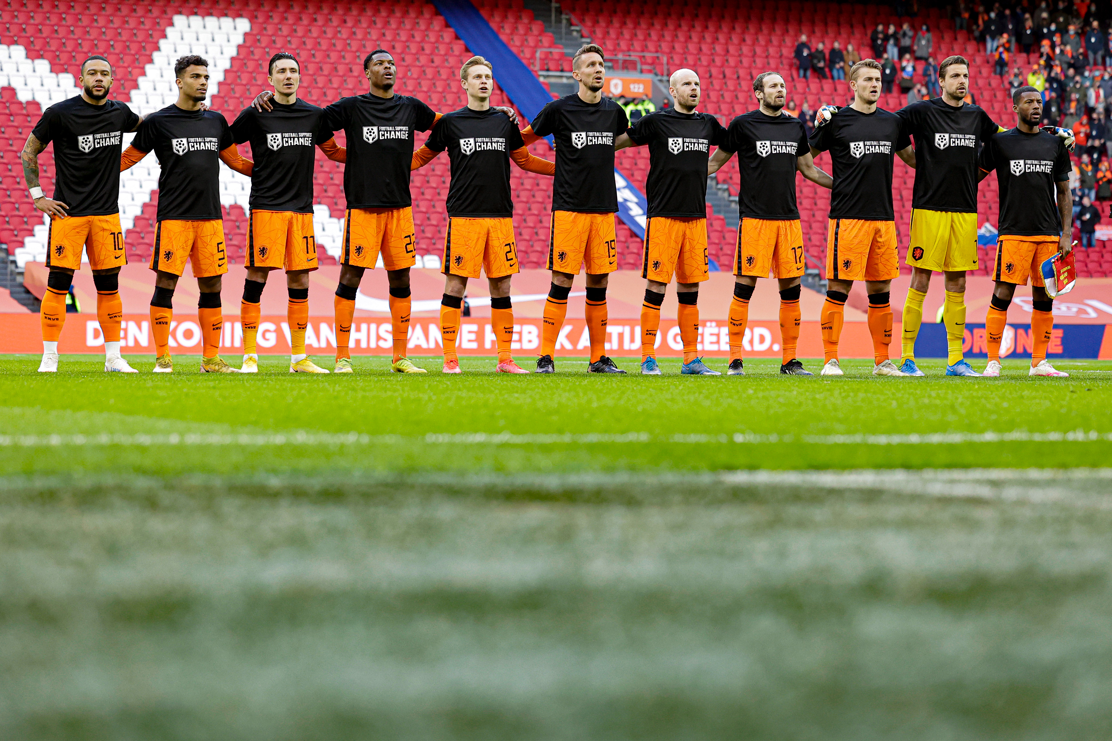 The Netherlands staged a similar act on Saturday Mar. 27, wearing shirts with the message “Football supports change” ahead of their qualifying match against Latvia.