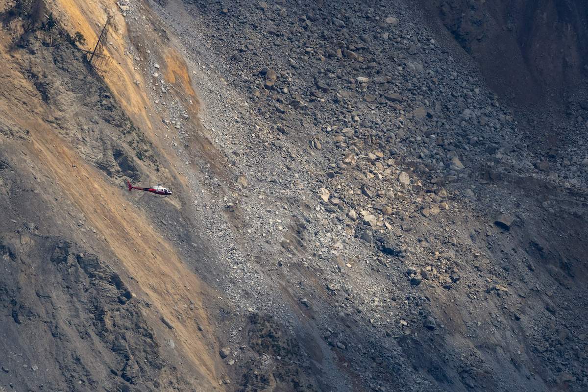 An helicopter flies next to a massive landslide that spared the village of Brienz, far-eastern Switzerland, on June 16, 2023. (Photo by ARND WIEGMANN/AFP via Getty Images)