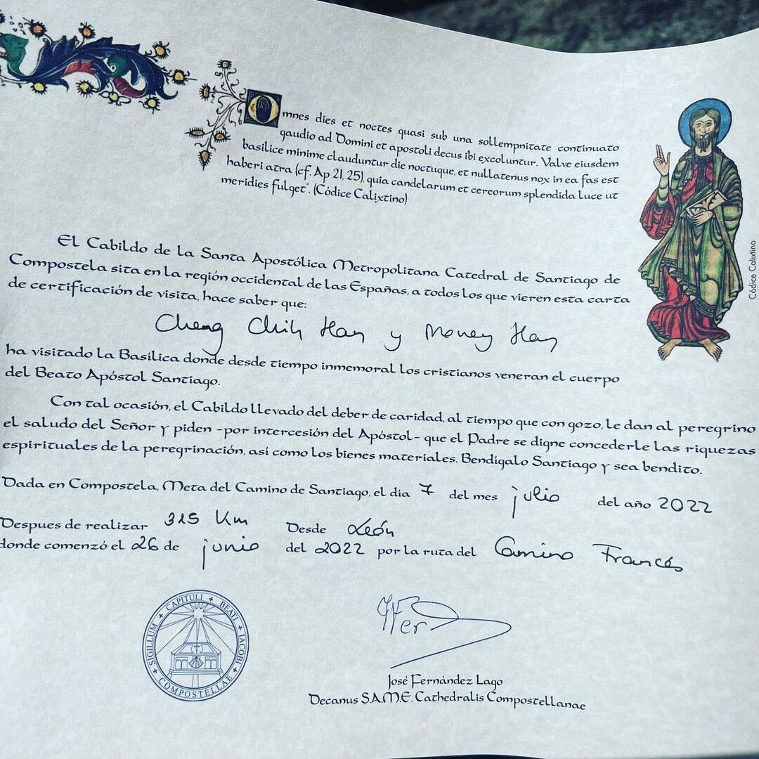 Beginning from Taiwan, a very good golden retriever followed his human on a 315 kilometer pilgrimage on the Camino de Santiago in Spain and received a certification with his name, Money.
