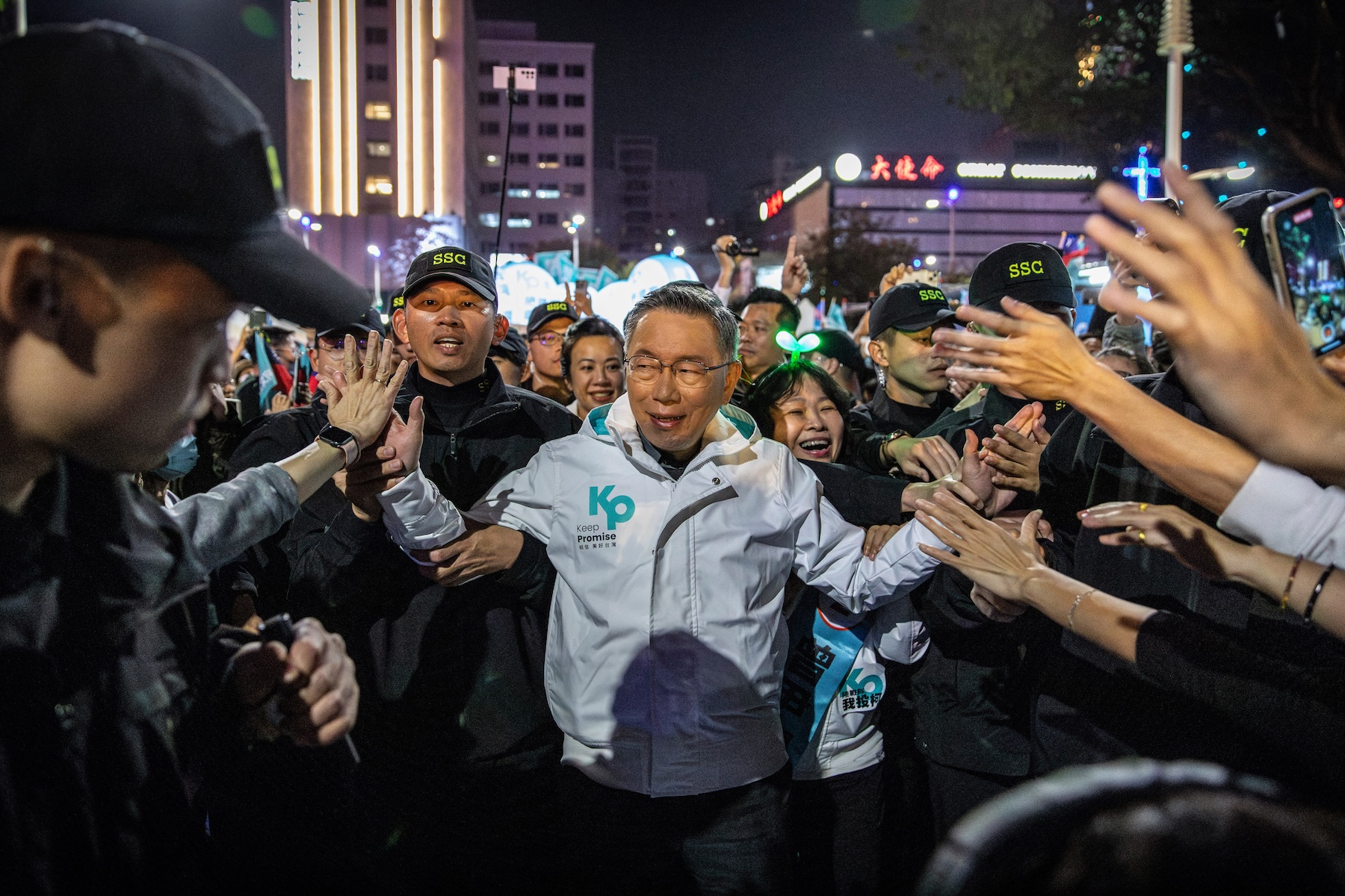 aiwan People’s Party (TPP) presidential candidate, Ko Wen-je greets supporters as he enters the TPP election campaign rally in Kaohsiung. (Photo by Alex Chan Tsz Yuk/SOPA Images/LightRocket via Getty Images)