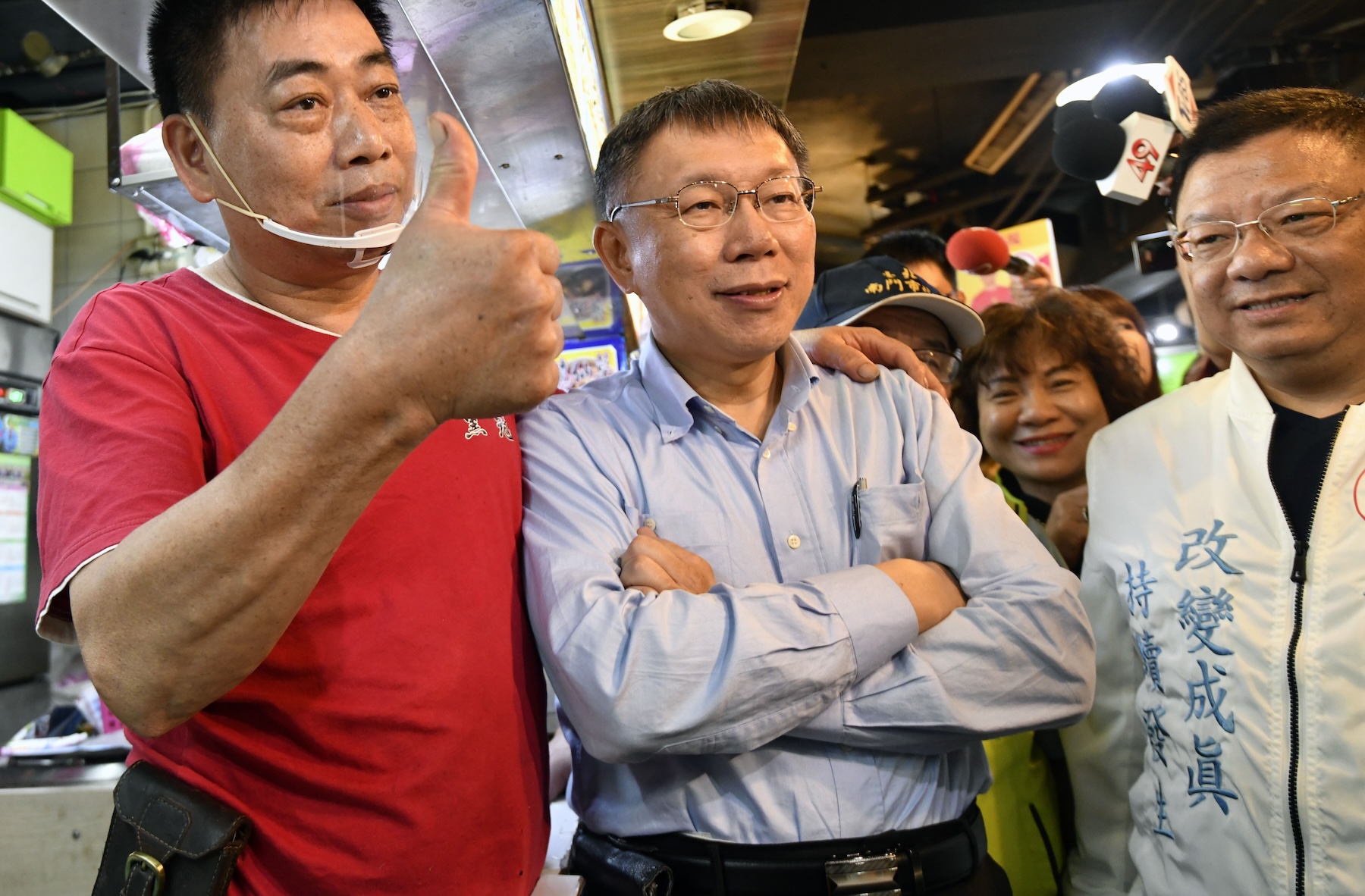 This picture taken on November 9, 2018 shows independent Taipei mayor candidate Ko Wen-je (C) posing for photos with a supporter (L) during the elections campaign at a traditional market in Taipei. (SAM YEH/AFP via Getty Images)