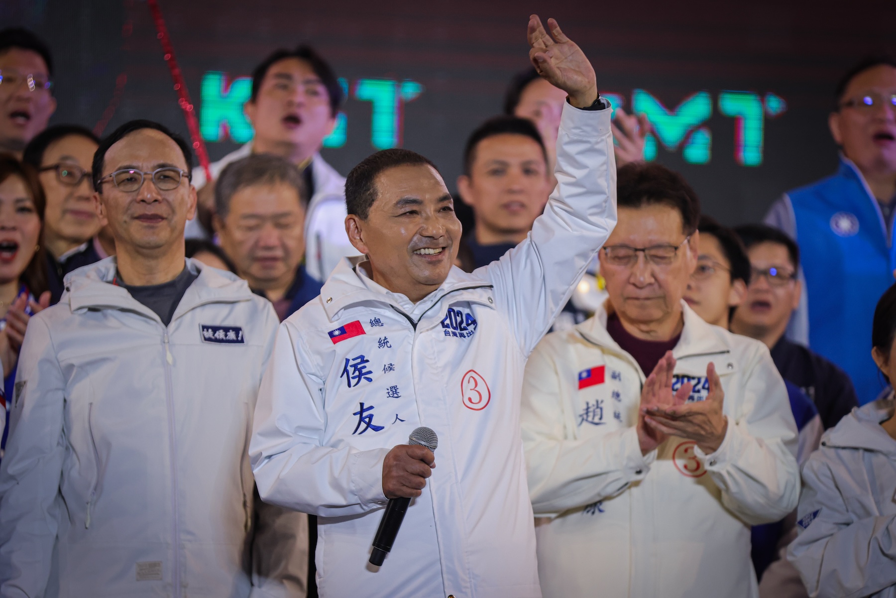 Kuomintang (KMT) presidential candidate, Hou Yu-ih (C) speaks at a campaign rally on the eve of general election on January 12, 2024 in Taipei, Taiwan. (Photo by Annice Lyn/Getty Images)