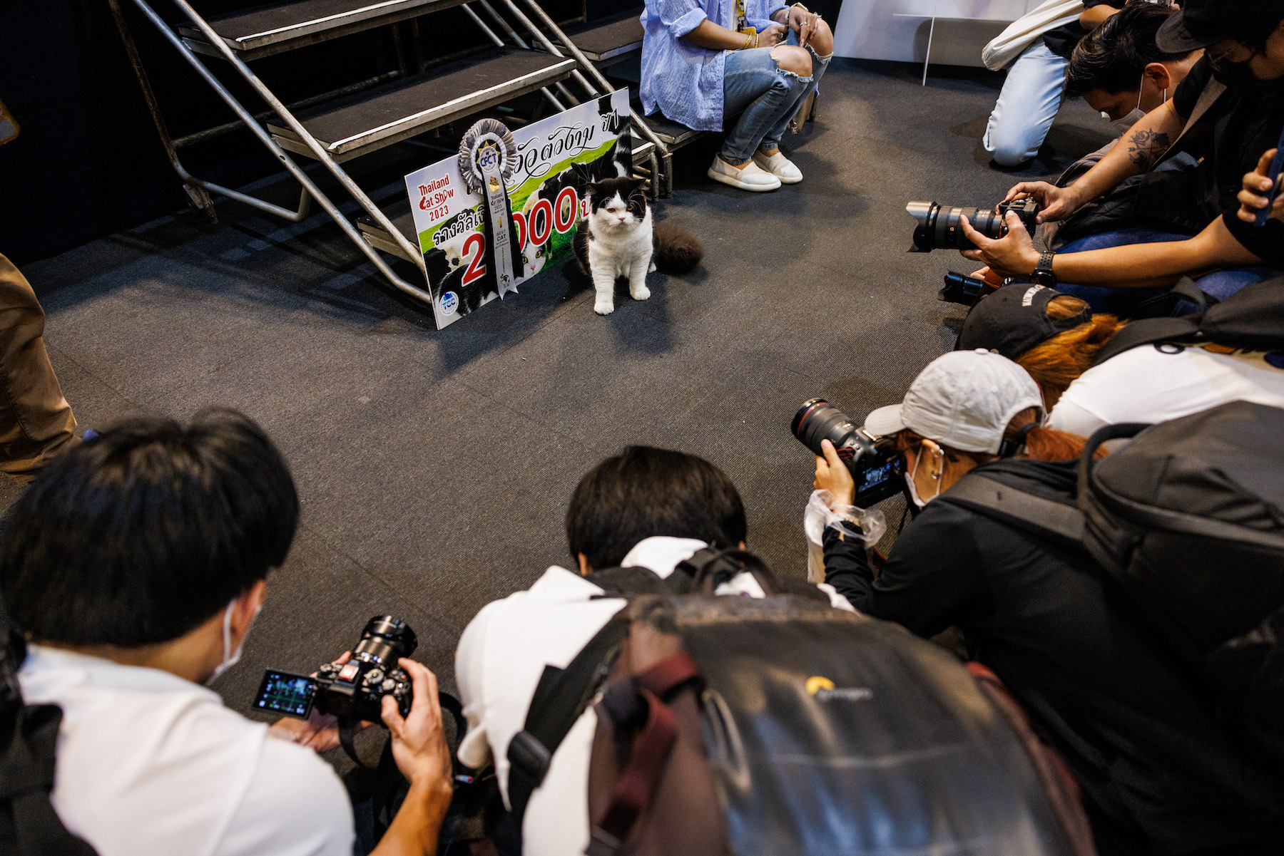 Members of the media take photos of Arpo, the first prize winner of the “Cats Who Look Like Cows” competition on March 05, 2023 in Bangkok, Thailand. (Photo by Lauren DeCicca/Getty Images)