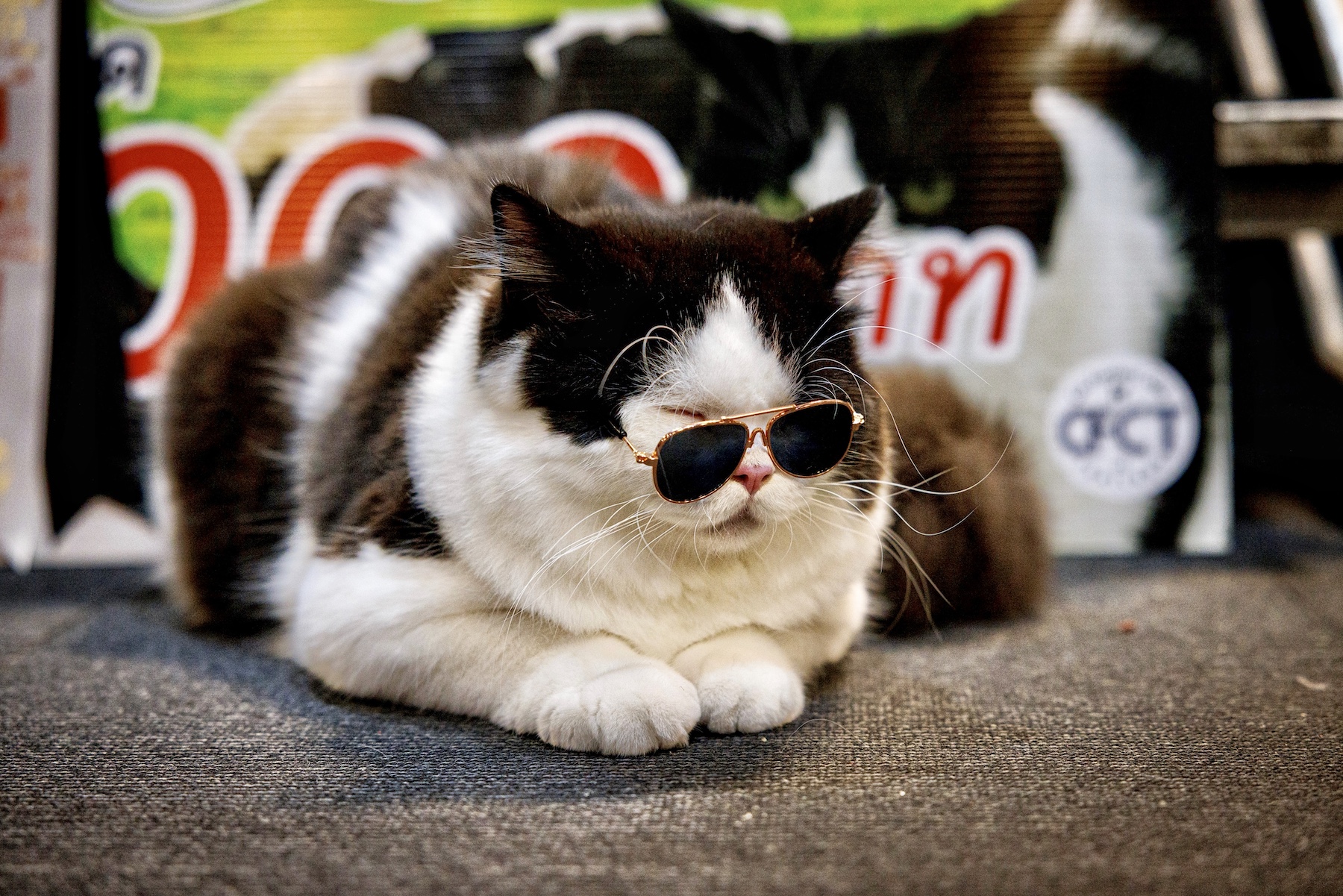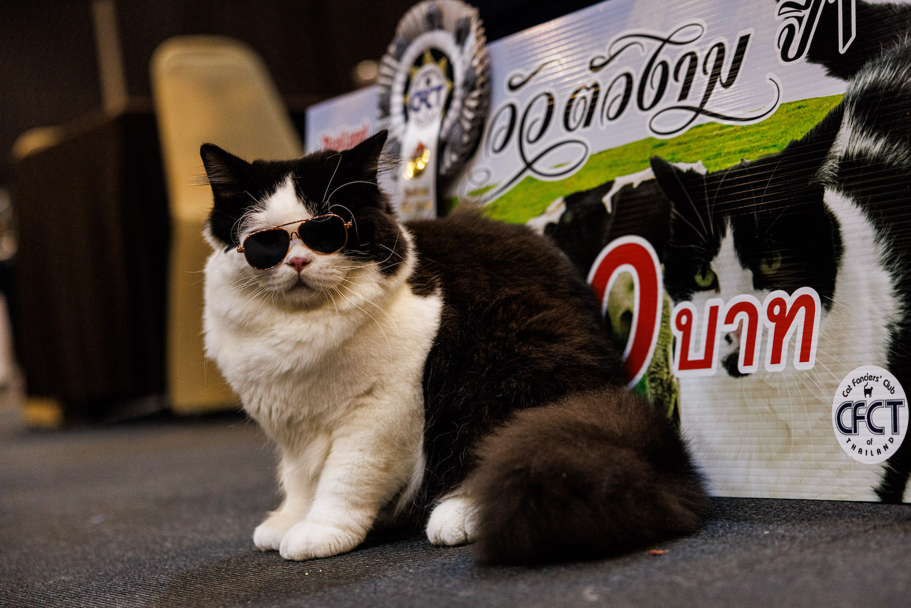 Arpo, the first prize winner of the “Cats Who Look Like Cows” competition poses for a portrait with sunglasses on March 05, 2023 in Bangkok, Thailand. (Photo by Lauren DeCicca/Getty Images)