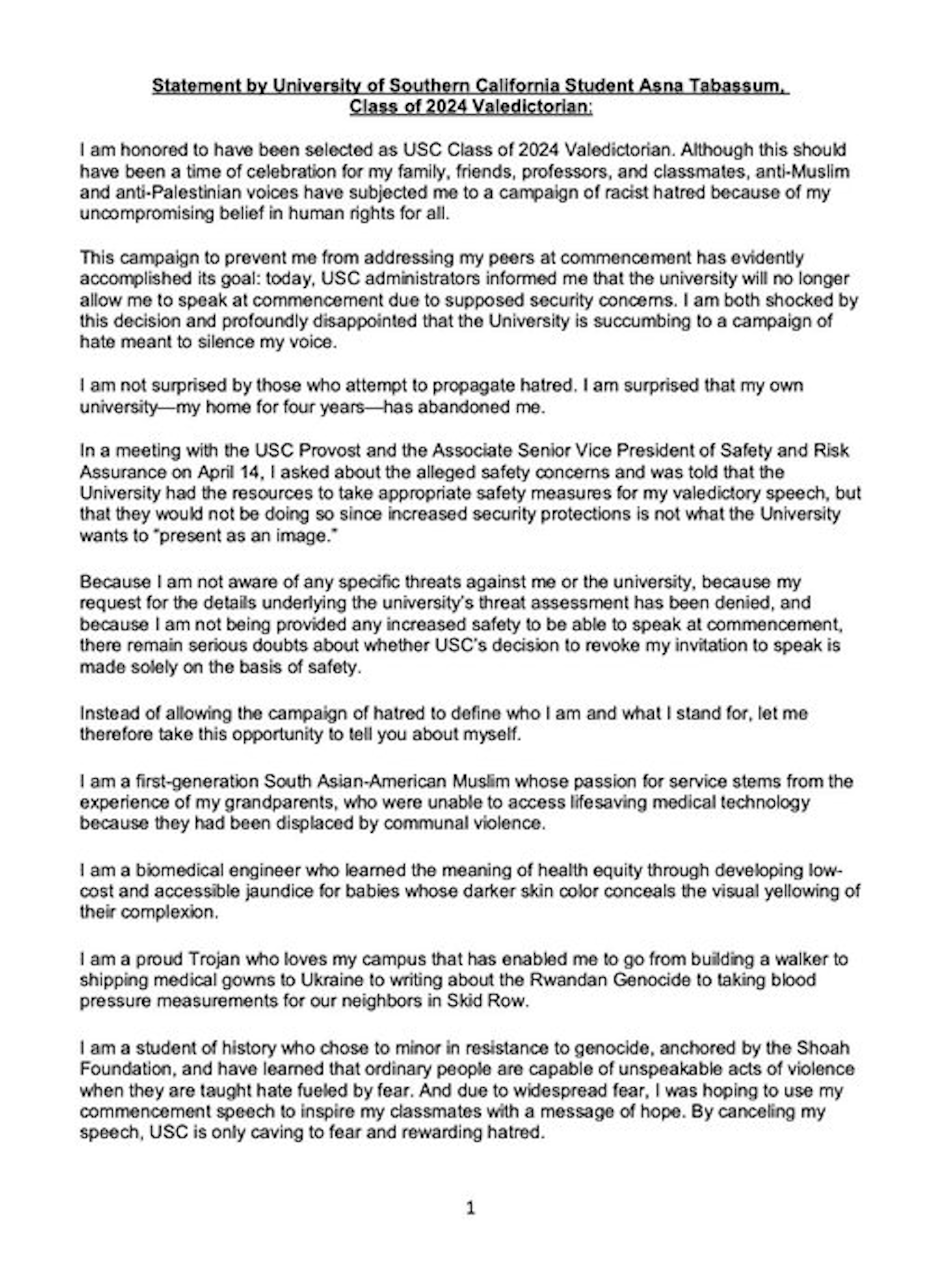 Then on Monday, April 15, USC announced that it was canceling Tabassum’s speech to “maintain campus safety and security”.