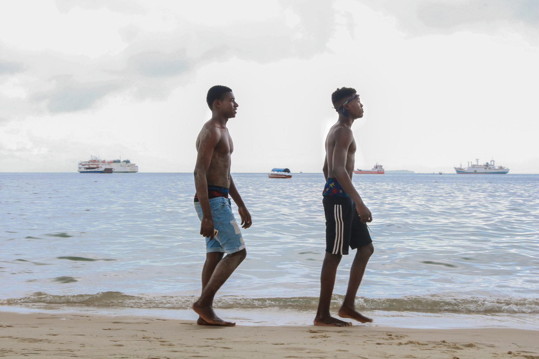 Two young men seen walking at the beach in Stone town Zanzibar. (Photo by Donwilson Odhiabo/SOPA Images/LightRocket via Getty Images)