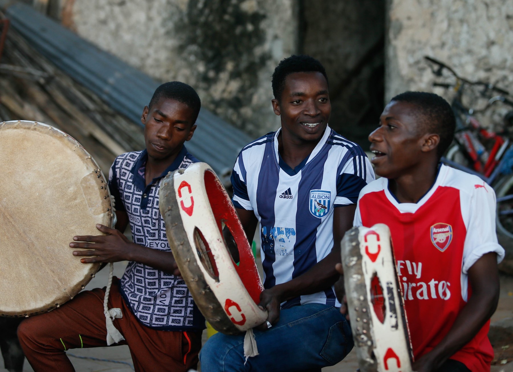Men play drums during a celebration in Zanzibar, Tanzania on August 27, 2018. (Photo by Mahmut Serdar Alakus/Anadolu Agency/Getty Images)
